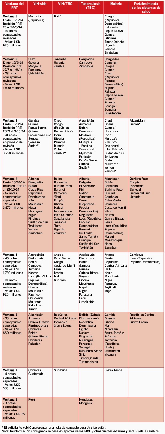 Esta sección indica el valor por componente de enfermedad que se revisará en cada ventana por banda y por enfermedad. También se indica cuándo los MCP deben remitir la nota conceptual en esa ventana del PRT. Se espera recibir aproximadamente 280 notas conceptuales durante el periodo de asignación. Del mismo, unas 136 notas conceptuales (o el 49%) serán revisadas por el PRT durante 2014, lo que representa aproximadamente el 68% del total del financiamiento. El Secretariado continúa observando una tendencia general de retraso en el envío de notas conceptuales por parte de los MCP, por requerir más tiempo para enviar notas más robustas. Por ejemplo, muchos MCP cambiaron el envío de sus notas de la ventana 3 a ventanas posteriores.